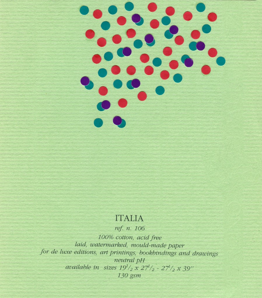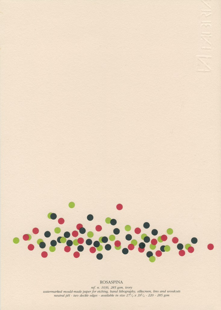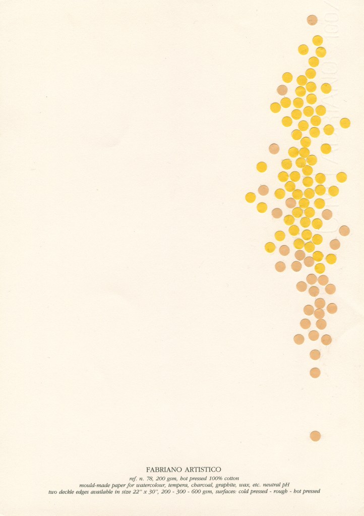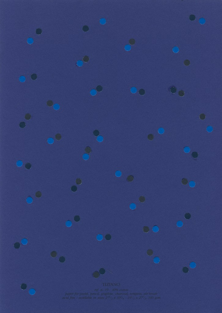 El pequeño círculo, como elemento básico, se multiplica en relaciones y colores sobre un soporte que adquiere protagonismo y dice lo suyo, soporte que habla de sí mismo, se presenta, se muestra, actúa, dialoga con los elementos dispuestos de múltiples maneras. Tal vez en interacciones secretas que se escapan al observador apresurado. Surgen entonces posibilidades que desafían la imaginación y que uno sospecha, no terminan ahí. Además no puedo evitar suponerte en tu propio accionar con el sacabocados, haciendo acopio de pequeños círculos*, bocados que Fabriano digiere y devuelve en asombrosas estructuras. Trabajo de orfebre y artesano en momentos de soledad que no es tal, dada la riqueza del interjuego de imaginación y materia. Es un planteo que, llevado a un código musical, anticipa inesperadas melodías, la sola disposición las sugiere en cada trabajo. Por lo tanto tu obra está viva, promete, incita, nos pone en contacto con lo infinito, este diálogo podría no tener fin e, incluso, uno quisiera seguir internándose en el misterio.