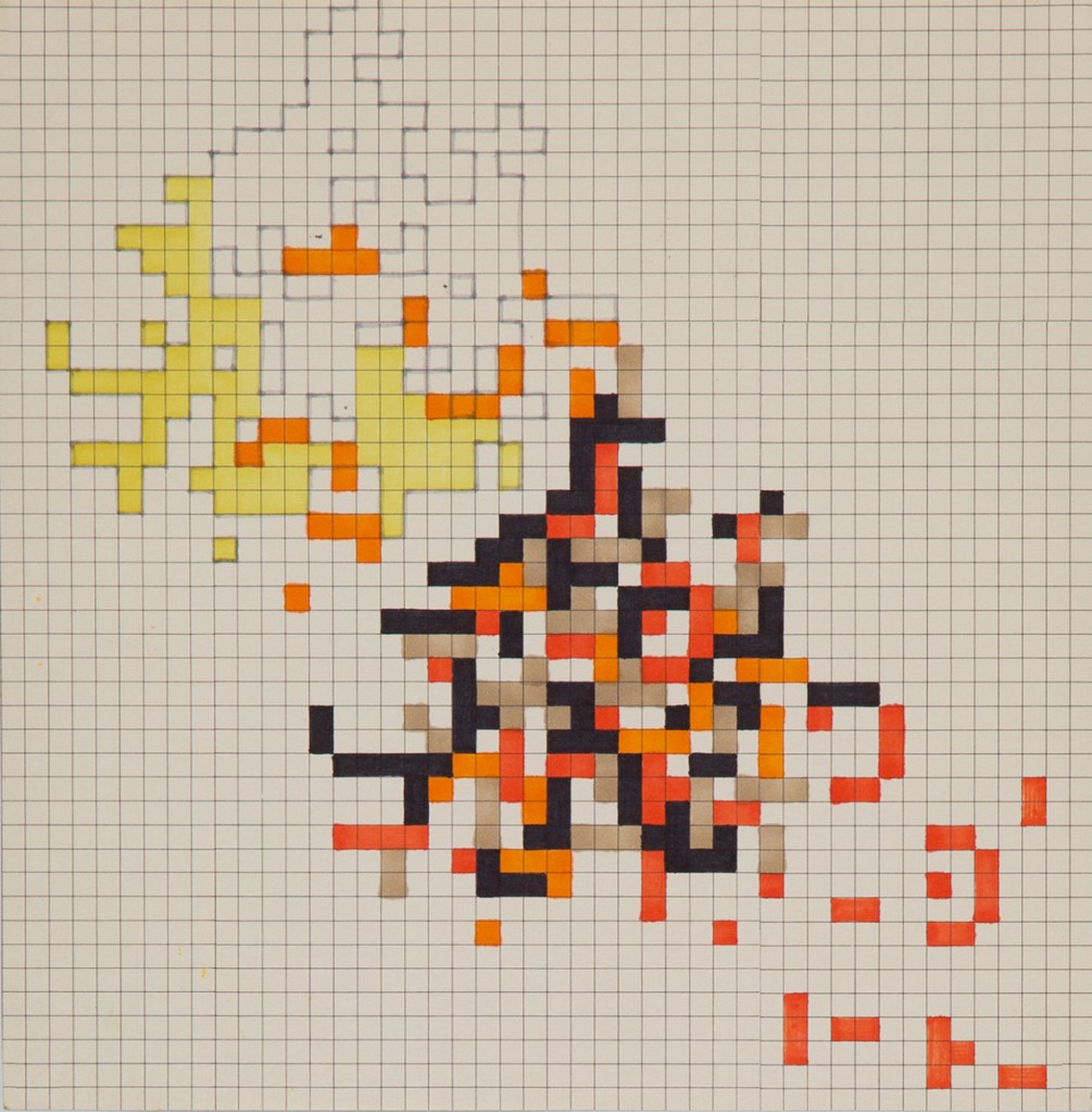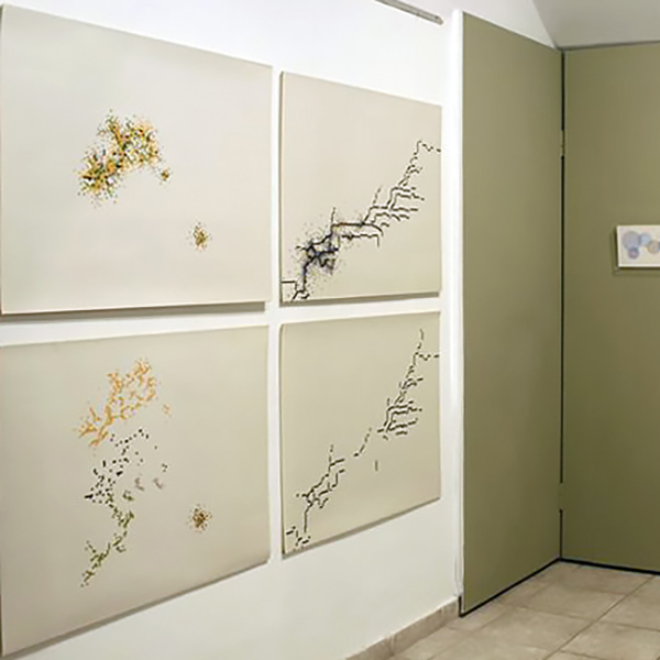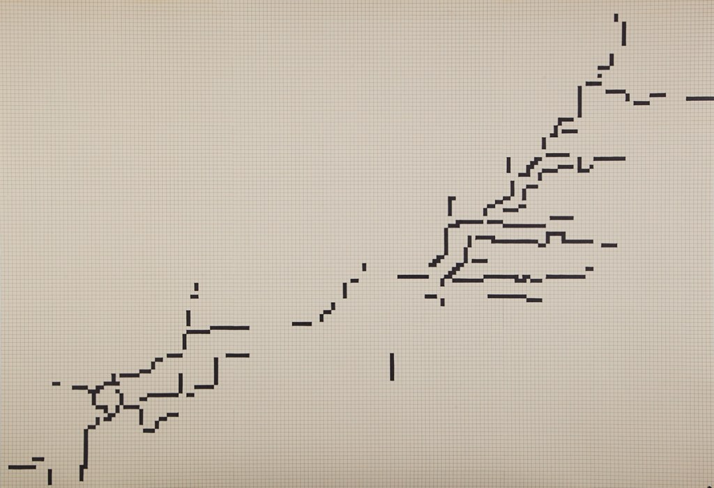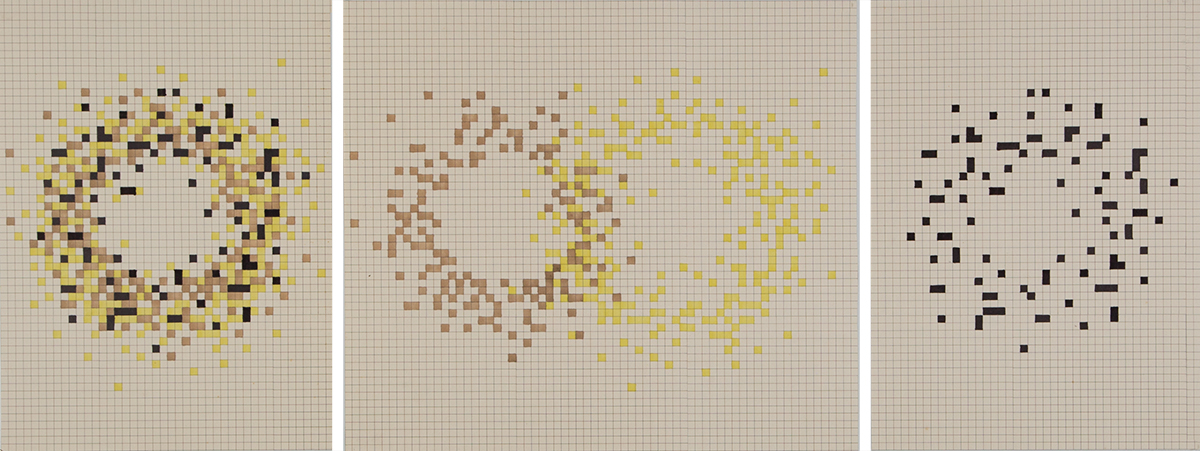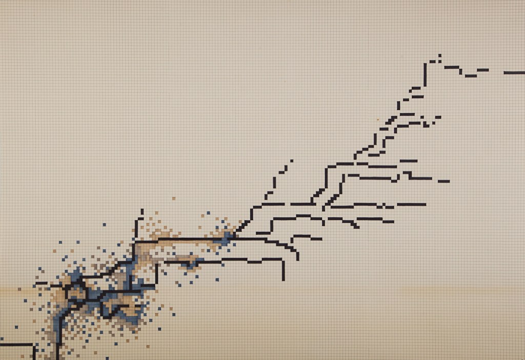 Discontinuos es una serie de dibujos sobre papel cuadriculado, desarrollada —mediante ejercicios de montajes y desmontajes gráficos— en torno a la idea de «pieza»: unidad que por su naturaleza móvil y su dimensión temporal, ofrece la posibilidad de armar, agrupar, recombinar, deshacer, volver a construir. Esta forma geométrica simple, opera como único elemento generador de construcciones inicialmente más complejas, que se deconstruyen en una segunda instancia —por selectiva y rítmica repetición— dejando una huella, un rastro de su configuración matriz. Es en este desplazamiento donde se imprime la temporalidad, algo sale, algo queda, retazos, signos de las cosas que nunca se mantienen fijas y estables.