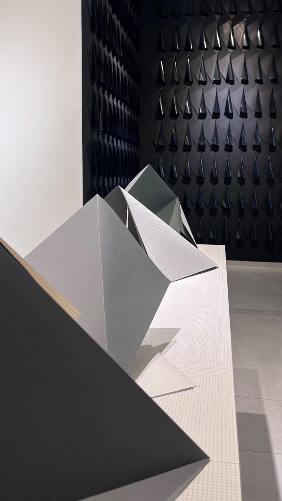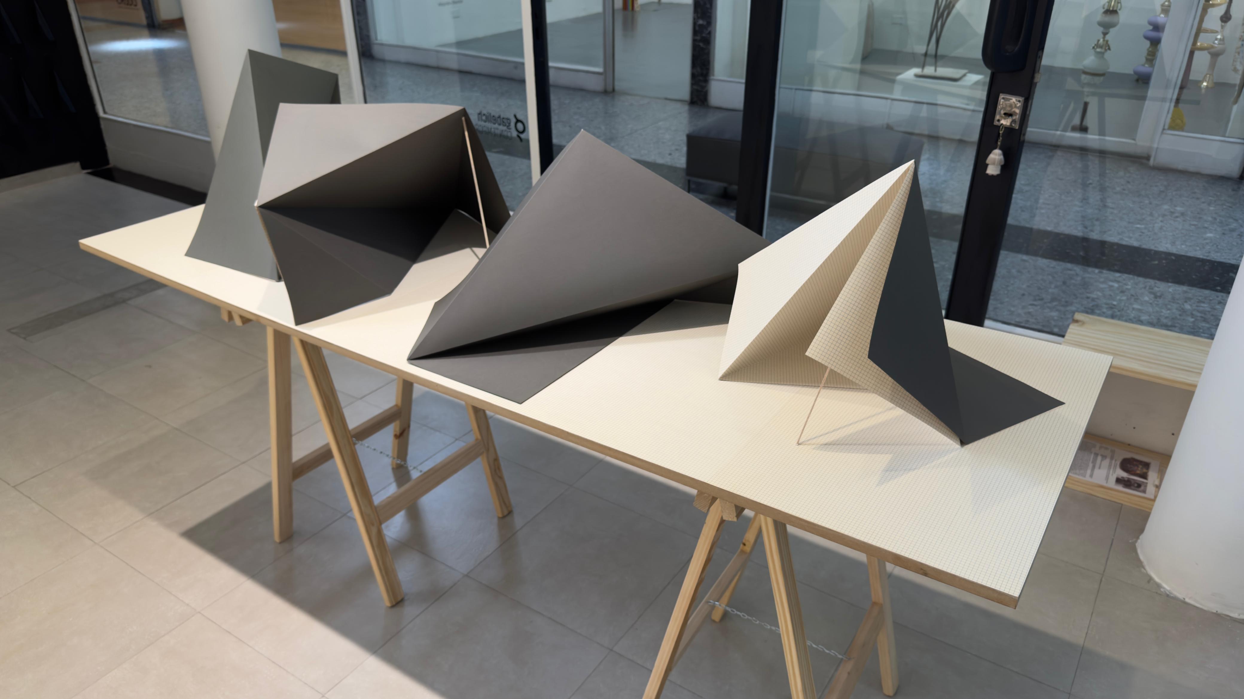 Poliedros, 2025, instalación, papel color y papel cuadriculado plegados, varilla de madera, tabla de MDF revestida con papel cuadriculado, caballetes de madera, medidas variables (60 x 40 x 50 cm c/u), presentada en la exposición En las inconsistencias, apoyarse, Gabelich Contemporáneo, Central Affair, Buenos Aires, Argentina.