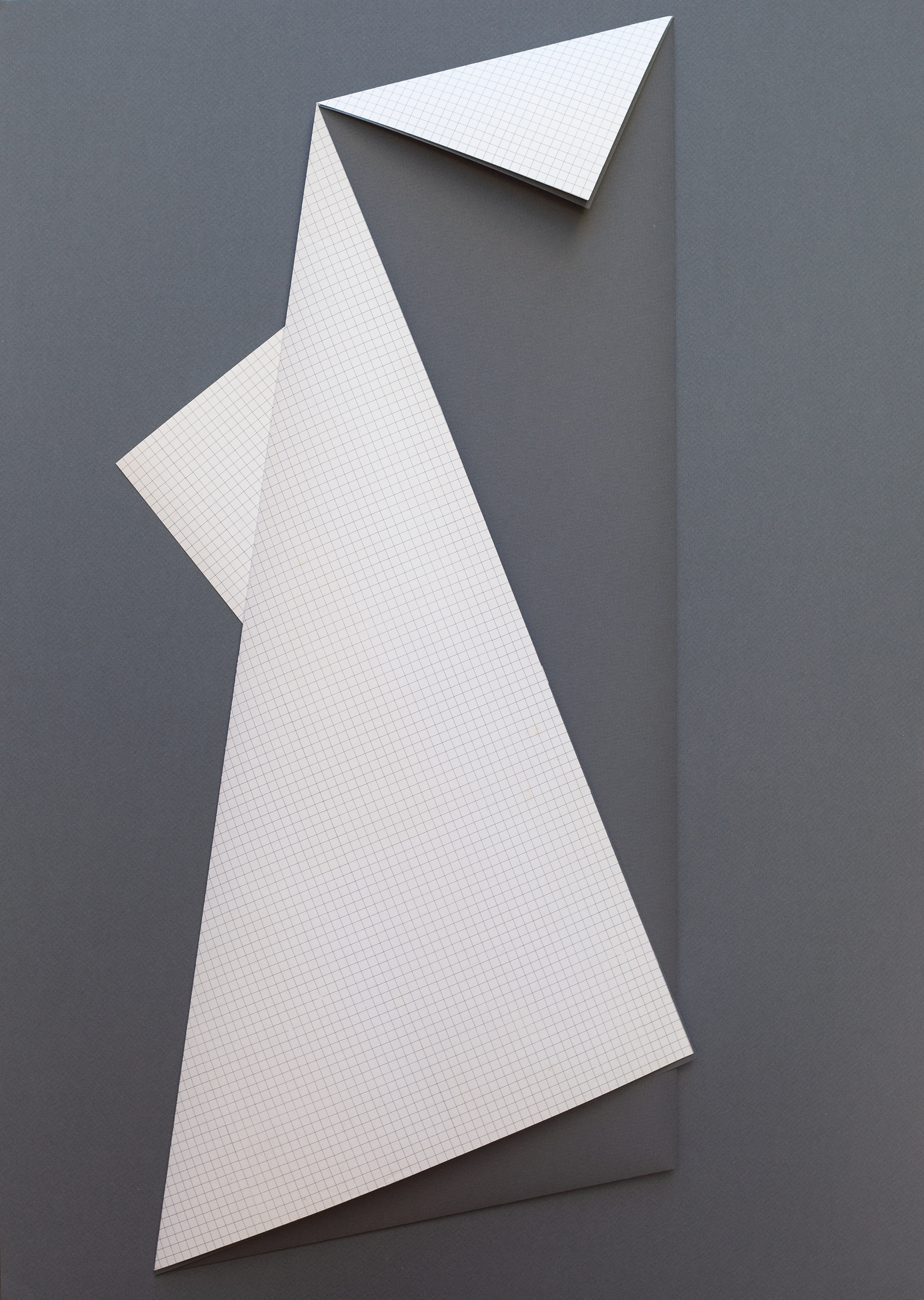 Poliedros designa un paisaje geométrico compuesto por una serie de esculturas de papel. El artista recurre al plegado para construir estos cuerpos abiertos y facetados que interactúan con la luz mientras dejan ver la cara y contracara del material elegido; como planos de ambientes interiores o de superficies externas.